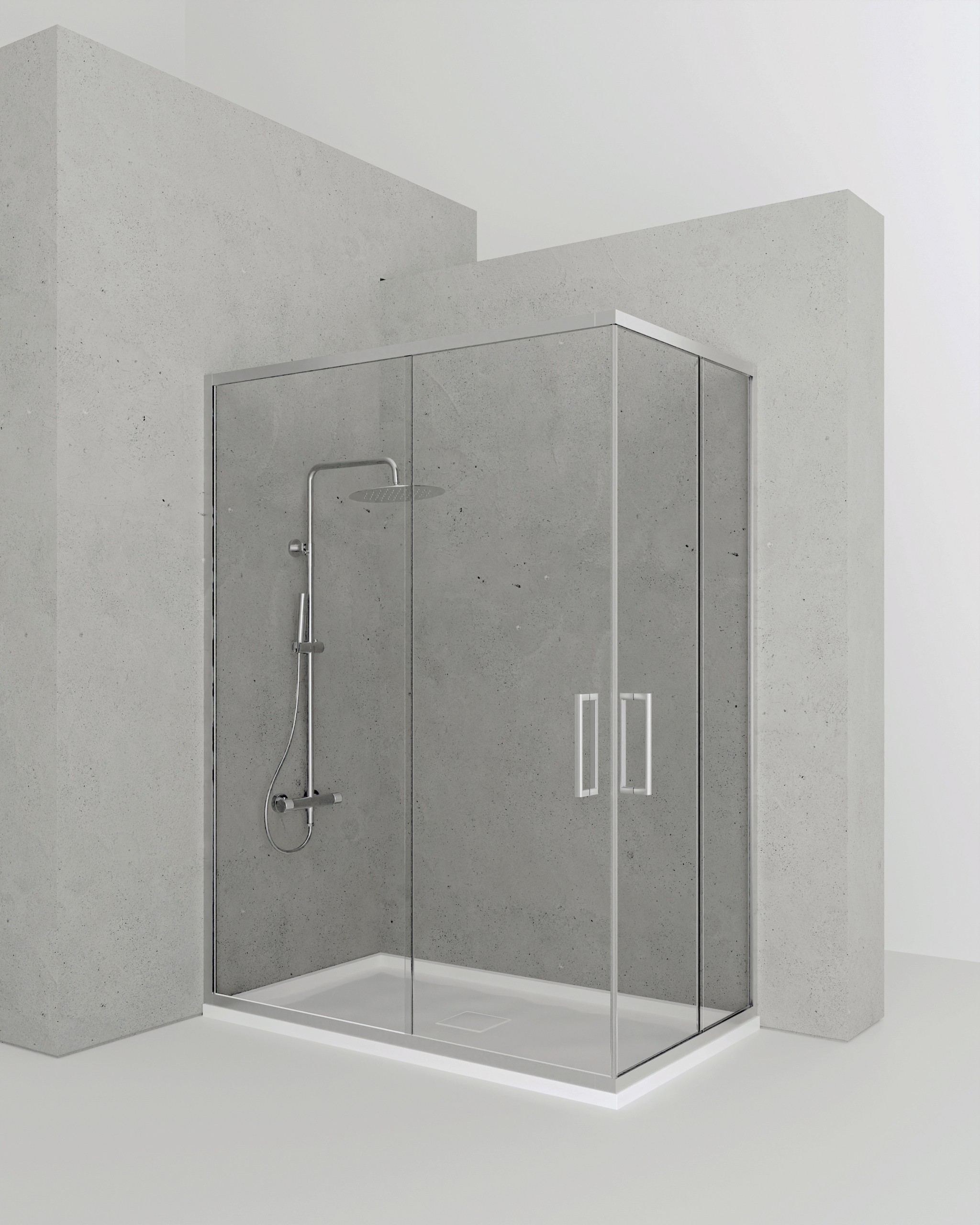 Vidro temperado | Formato angular | 2 portas de correr | Medidas 130×80 cm | Perfis em alumínio anodizado | Instalação reversível | Design funcional | PAULISANI